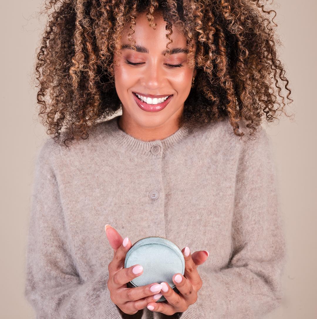 Young girl wearing a small cupcake earring against a plain backgroundSilver cupcake-shaped earrings on a light pink background.