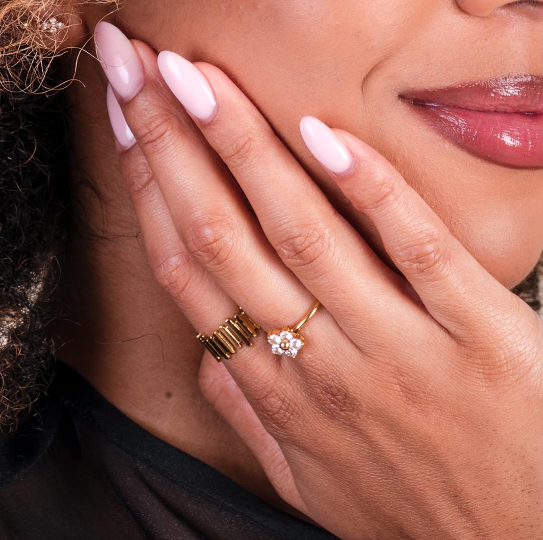 Close-up of a girl wearing a daisy flower earring.Set of three earrings: a daisy, rainbow, and unicorn on a light pink background