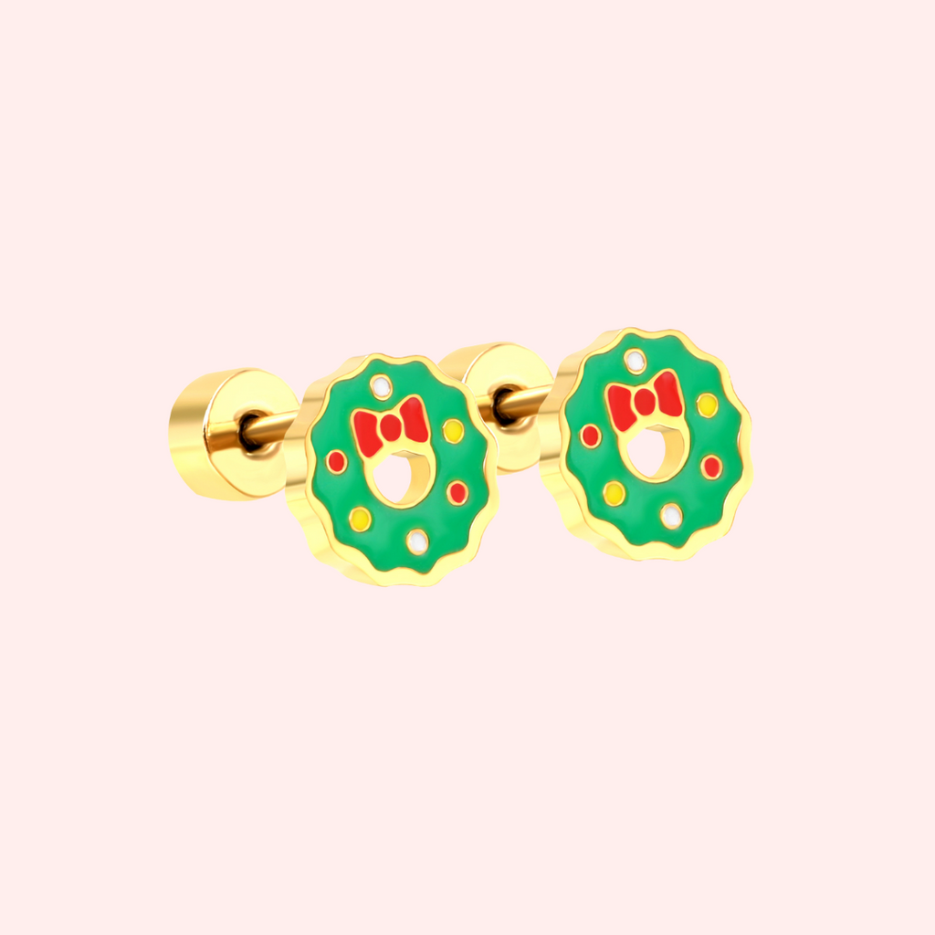Our Christmas Wreath Flat Back Stud Earrings are the perfect everyday touch of festive sparkle. Choose between gold or silver stainless steel to match your holiday look!