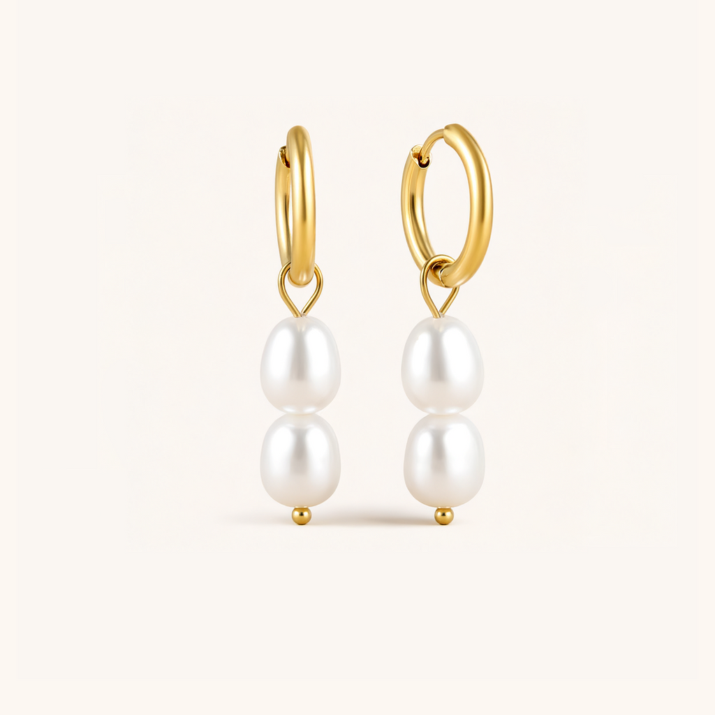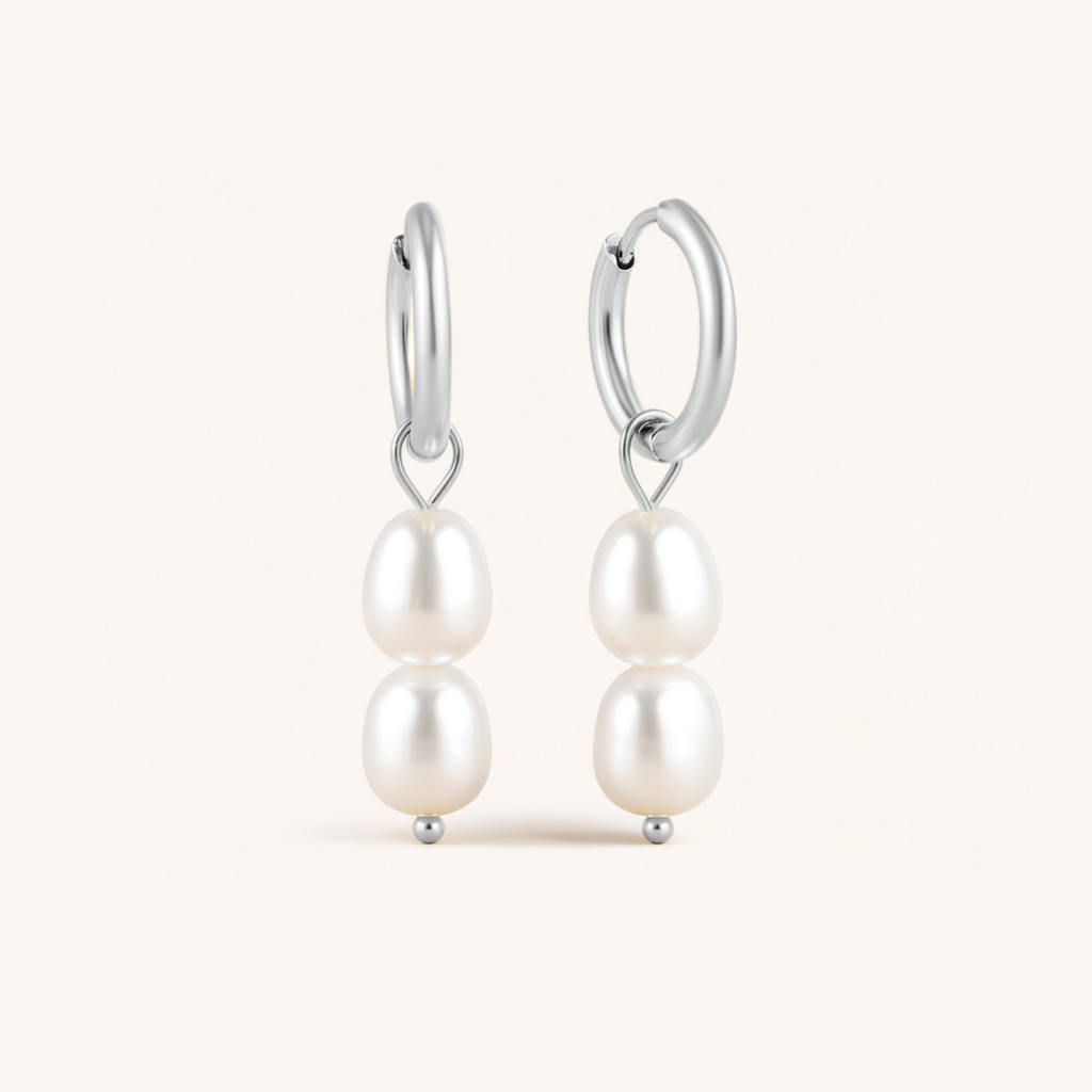 Featuring two delicate pearls on sleek silver or gold hoops, they add just the right touch of elegance and shine.