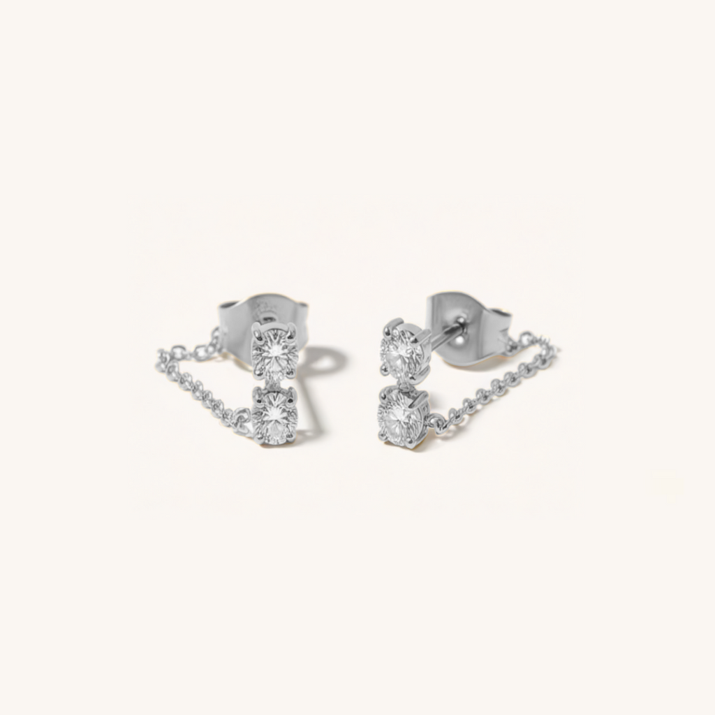 Delicate chains loop to two sparkling CZs, perfect to stack with your favourites or wear alone as a subtle statement. Playful, sparkling, and effortless.