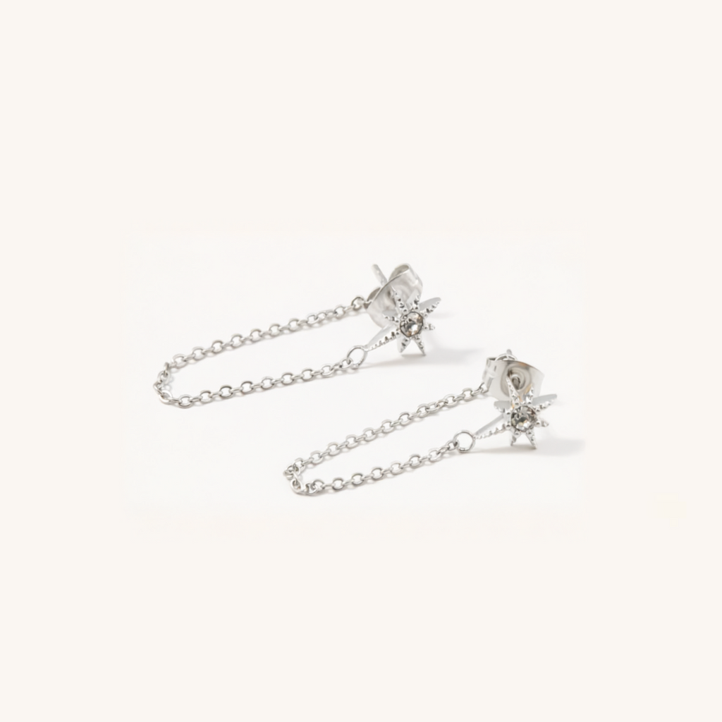 Add instant sparkle with the Starburst Chain Stud Earrings. This dainty star and chain design makes a statement alone or layered with your favourites.