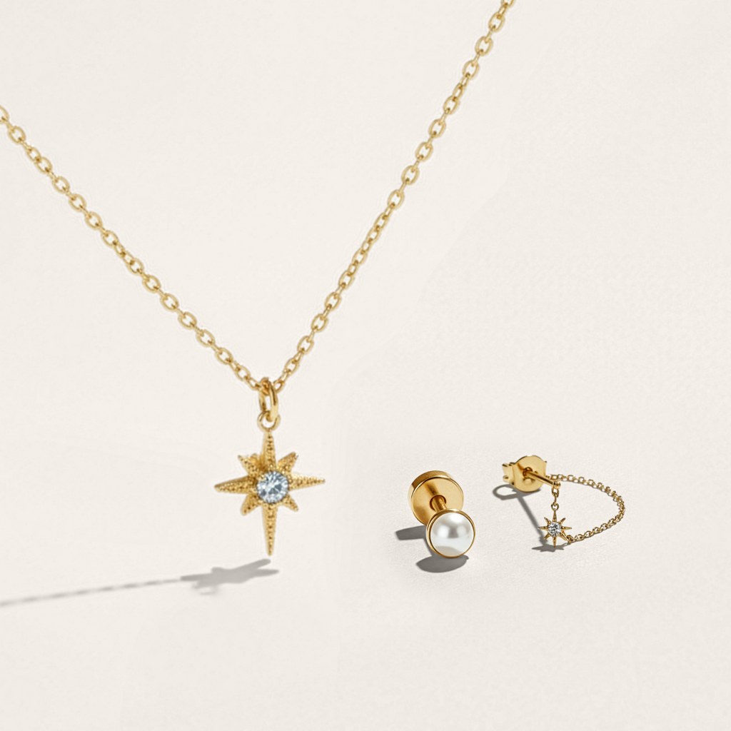 Featuring the Starburst Charm Necklace + Starburst Chain Stud Earrings, and the Classic White Pearl Bead Flat Back Earrings , this set works beautifully together or as individual pieces.